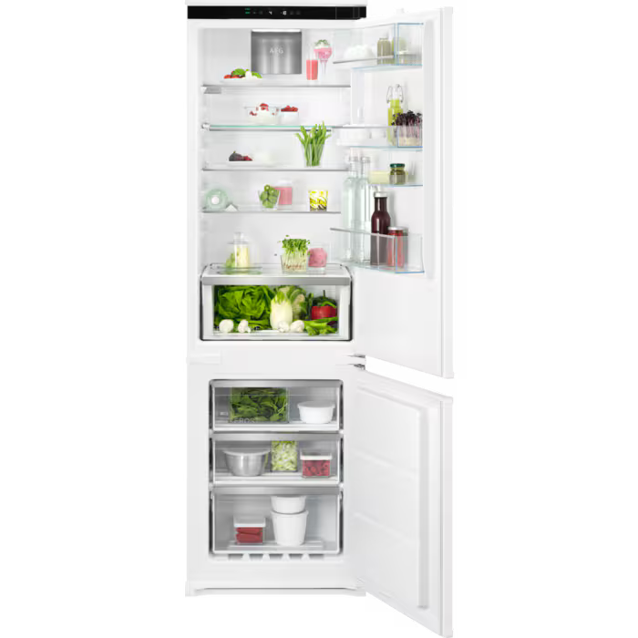 De AEG TSC7G181DS is een ruime inbouw koel-vriescombinatie van 178 cm met TwinTech NoFrost-technologie en GreenZone, speciaal ontworpen voor middelgrote tot grote huishoudens. Dankzij TwinTech NoFrost hoef je nooit meer handmatig te ontdooien, waardoor je tijd bespaart en het apparaat altijd optimaal blijft presteren.