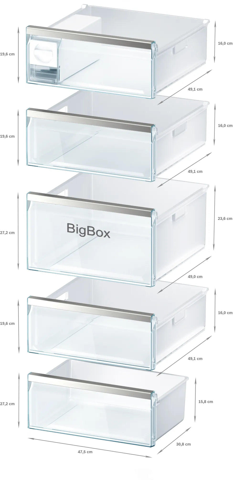 Met de SuperVriezen-functie worden nieuwe producten snel ingevroren zonder dat reeds bewaarde etenswaren ontdooien. De praktische BigBox XXL-lade en het VarioZone-systeem bieden extra flexibiliteit voor het bewaren van grote of onhandige verpakkingen. Voor extra gemak beschikt de vrieskast over een digitale temperatuurweergave aan de buitenzijde en een open-deur-alarm.