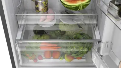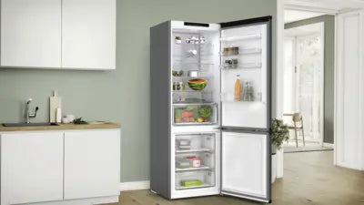Dankzij functies als SuperKoelen en SuperVriezen worden nieuwe producten sneller op temperatuur gebracht, terwijl MultiAirflow zorgt voor een gelijkmatige luchtcirculatie. De LED-verlichting biedt een helder overzicht en het open-deur-alarm waarschuwt wanneer de deur te lang openstaat. Bovendien maakt deze koelkast deel uit van Bosch Green Collection: geproduceerd met 50% minder CO₂-uitstoot door het gebruik van groen staal en bioplastics.