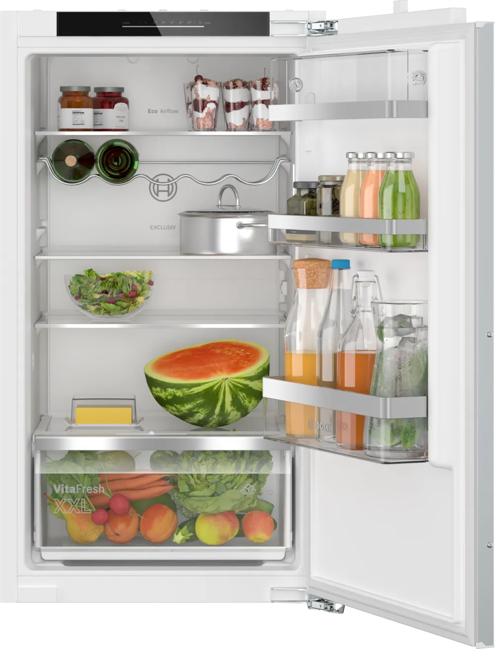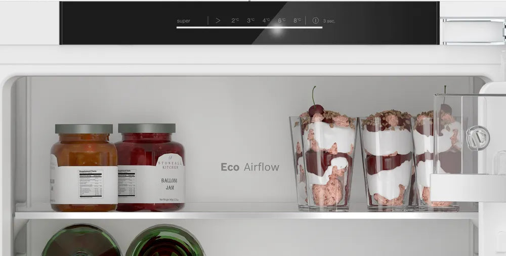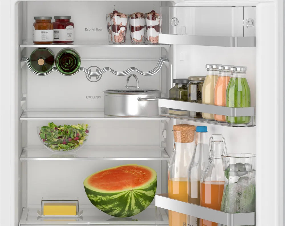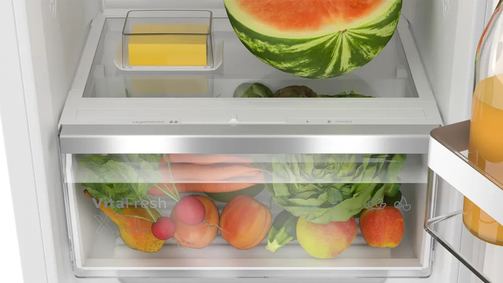 De Bosch KIR31EDD1 is een compacte inbouwkoelkast zonder vriesvak, ideaal voor kleinere keukens of als extra koelruimte. Met 165 liter inhoud, energieklasse D en een fluisterstil geluidsniveau van slechts 27 dB combineert hij efficiëntie met comfort. De VitaFresh-lade houdt groente en fruit langer vers, terwijl Eco Airflow zorgt voor een gelijkmatige temperatuur in de hele koelkast. Dankzij de SuperKoelen-functie worden verse producten snel op temperatuur gebracht zonder dat andere levensmiddelen opwarmen. De heldere LED-verlichting geeft perfect zicht, en de sterke veiligheidsglasplateaus bieden een stabiele opslag voor al je etenswaren.