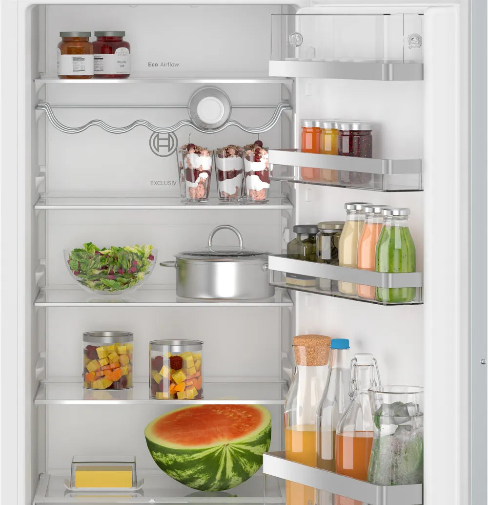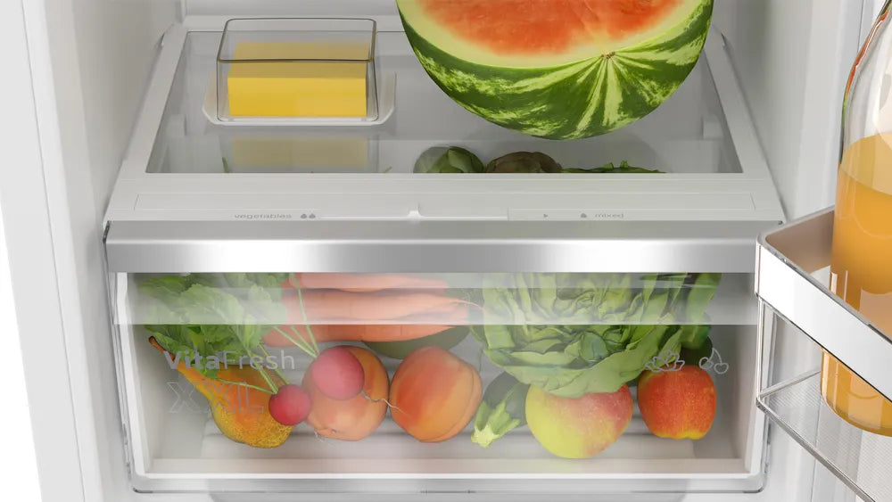 De Bosch KIR41EDD1 is een stille en energiezuinige inbouwkoelkast zonder vriesvak, ideaal voor wie vooral veel koelruimte zoekt. Met een inhoud van 204 liter, energieklasse D en een geluidsniveau van slechts 28 dB is deze koelkast fluisterstil en efficiënt. De VitaFresh-lade houdt groente en fruit langer vers, terwijl EcoAirflow zorgt voor een constante temperatuur in het hele koelgedeelte. Dankzij de SuperKoelen-functie worden nieuwe boodschappen snel gekoeld zonder dat reeds gekoelde producten opwarmen. De heldere LED-verlichting zorgt dat alles goed zichtbaar blijft, en met de vlakke SoftClose-deur sluit hij altijd zacht en stevig.