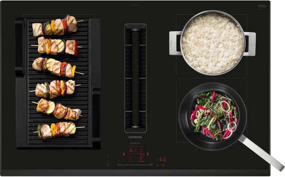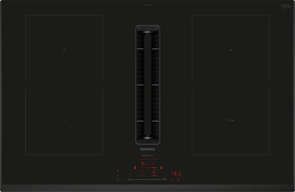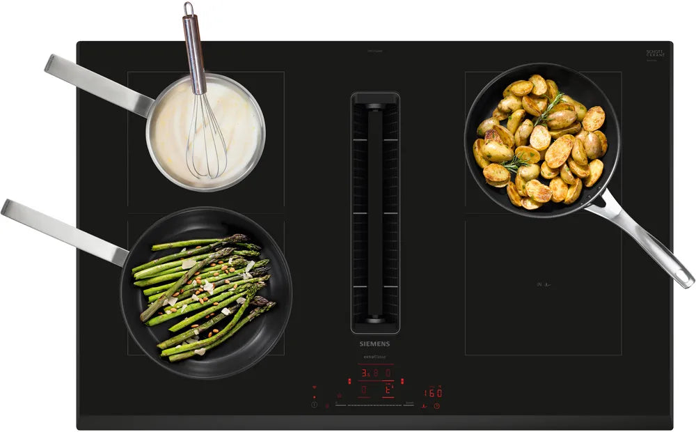 De Siemens ED851HQ26M combineert een krachtige inductiekookplaat met een geïntegreerd afzuigsysteem in één elegant design van 80 cm breed. Deze premium kookplaat met TouchSlider-bediening biedt ultiem gebruiksgemak en een strak, facetgeslepen glazen oppervlak dat perfect past in elke moderne keuken.