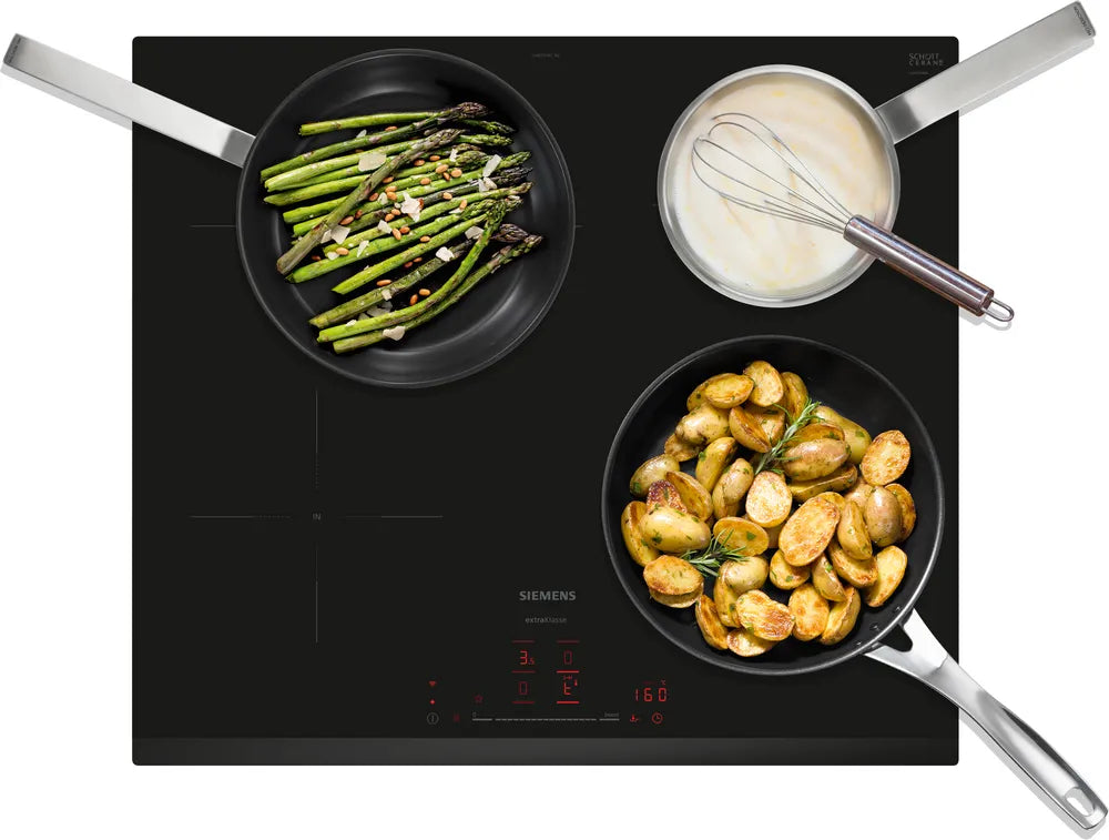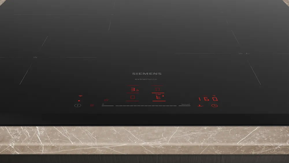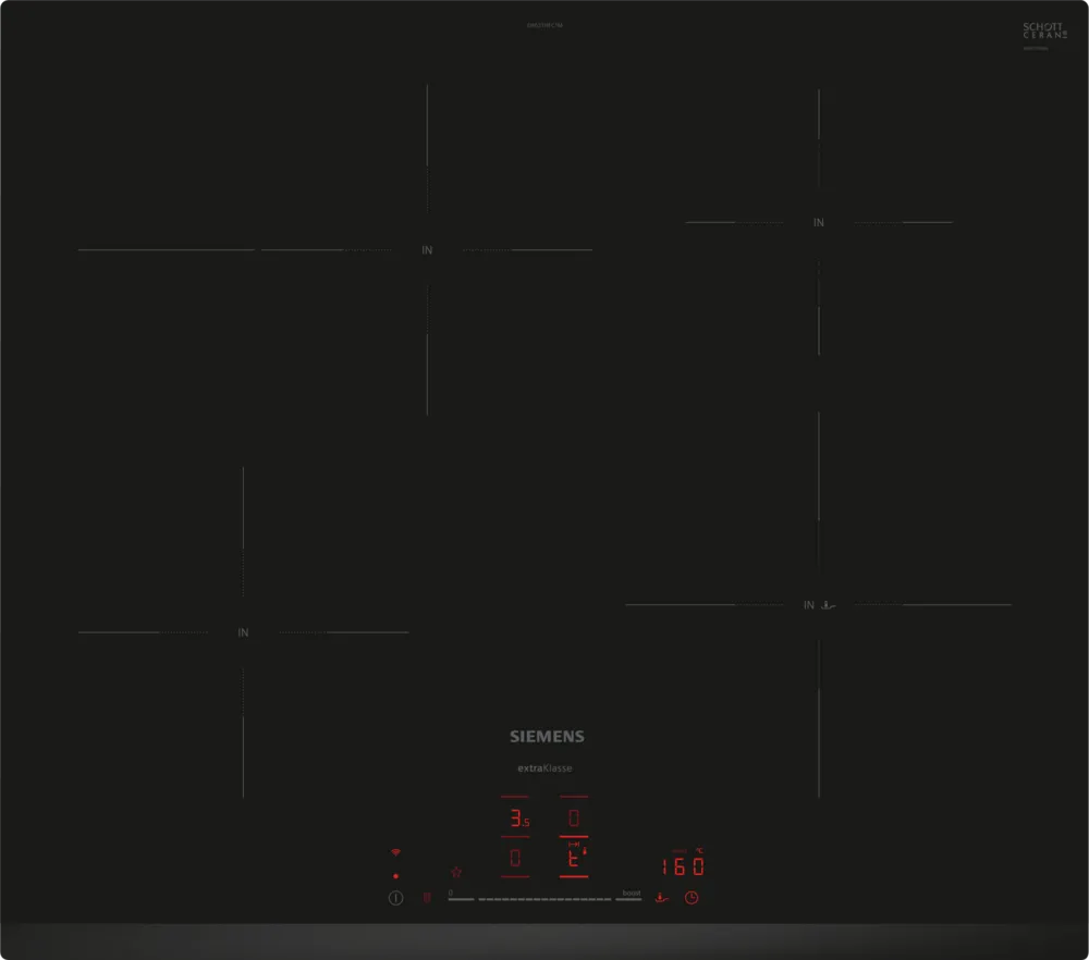 De Siemens EH631HFC1M is een stijlvolle en veelzijdige inductiekookplaat van 60 cm breed, ontworpen voor precisie en gebruiksgemak. Dankzij de uitbreidbare braadzone heb je extra ruimte voor grote pannen of braadsledes. Met de TouchSlider-bediening regel je het vermogen moeiteloos met één vinger, en met 17 standen heb je altijd de juiste temperatuur binnen handbereik.