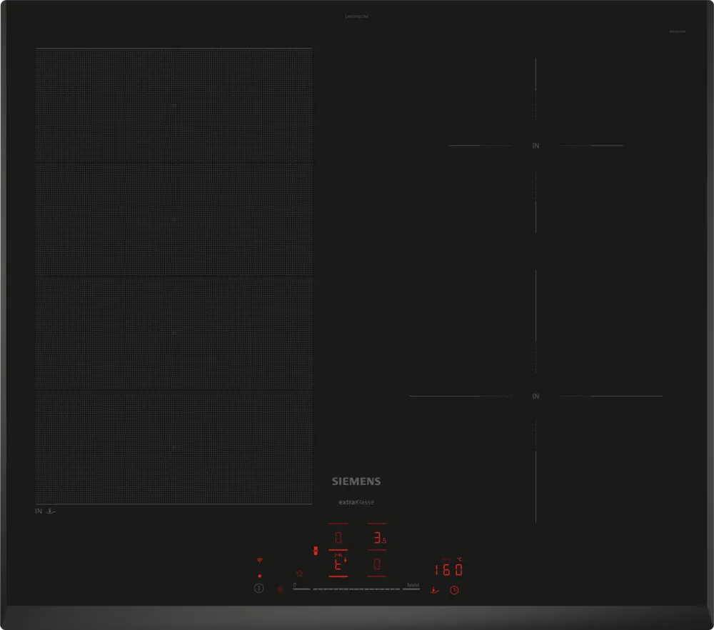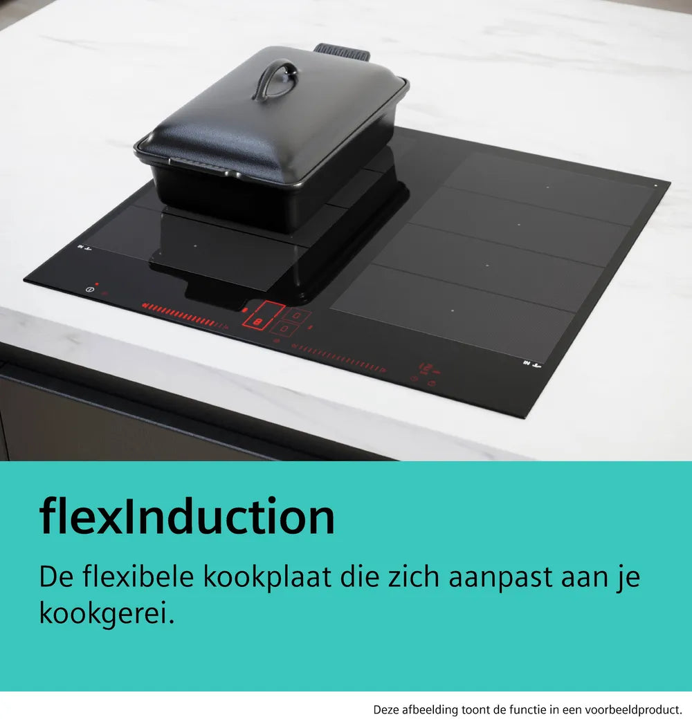 De Siemens EX651HEC1M is een stijlvolle inductiekookplaat van 60 cm breed met slimme functies die het koken eenvoudiger, sneller en veiliger maken. De flexInduction-zone past zich automatisch aan de grootte en vorm van je kookgerei aan, of je nu één grote pan of meerdere kleine pannen gebruikt.