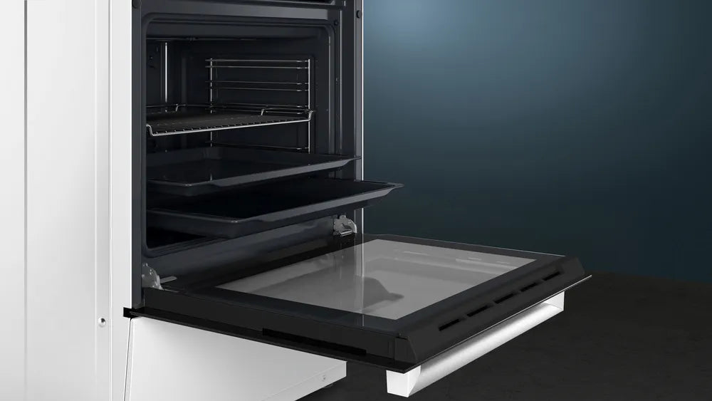 Met een strak wit design, Perilex-aansluiting (7900 W) en een volledig glazen binnendeur past de Siemens HL1P00020U perfect in iedere moderne keuken.