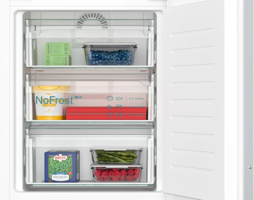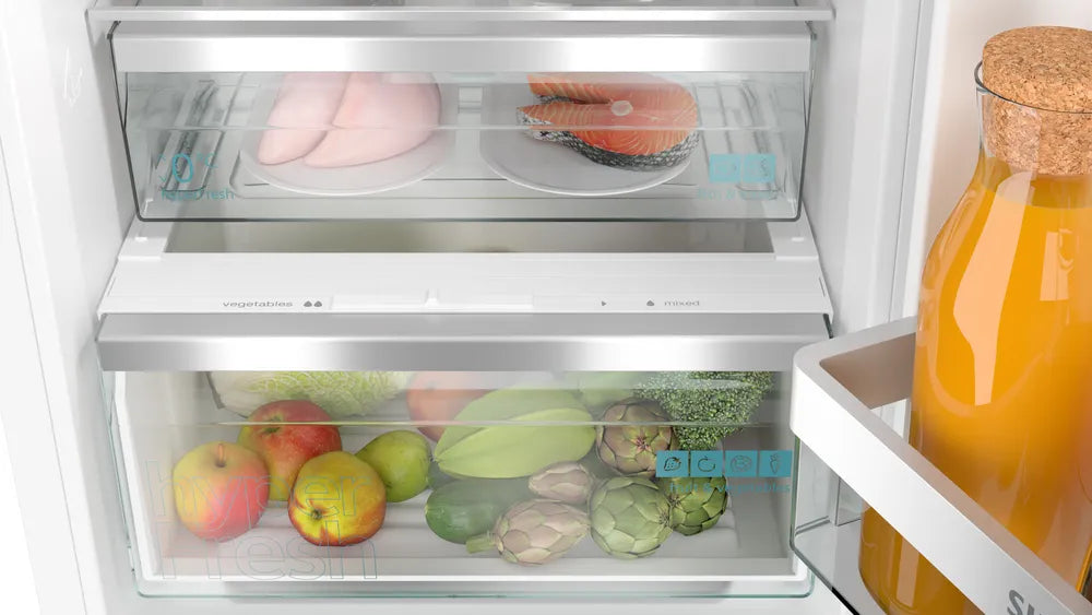 De Siemens KI86NEDD0 is een moderne en efficiënte inbouw koel-vriescombinatie met een totale inhoud van 260 liter (184 liter koelen + 76 liter vriezen). Dankzij de NoFrost-technologie hoef je de vriezer nooit meer handmatig te ontdooien, terwijl het HyperFresh-vershoudsysteem zorgt dat groenten en fruit langer vers blijven.