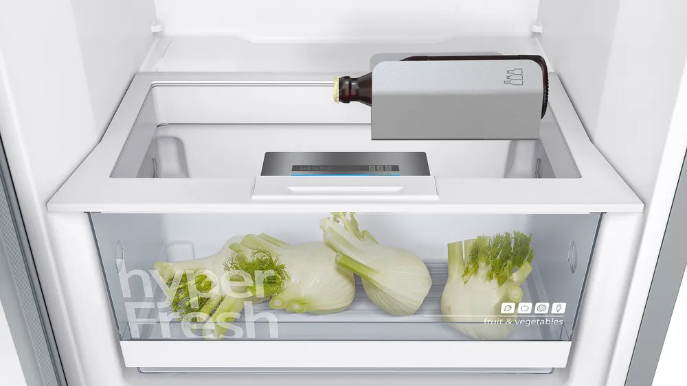 De Siemens KS36VGIDP iQ300 extraKlasse combineert elegant design met slimme koeltechnologie voor een optimaal bewaarresultaat. Met een royale inhoud van 346 liter en energieklasse D is deze vrijstaande koelkast ideaal voor grotere huishoudens die veel verse producten bewaren. Dankzij het hyperFresh-systeem blijven groenten en fruit langer knapperig en vol smaak, terwijl je met de superKoelen-functie nieuwe boodschappen razendsnel terugbrengt op de juiste temperatuur.